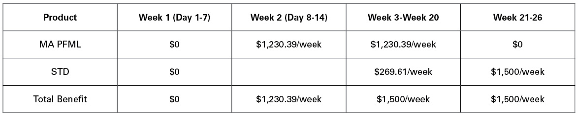 1. They have a salary that warrants a $1,500 weekly Short Term Disability benefit, and a $1,230.39 weekly MA PFML benefit. The chart below illustrates how these benefits will coordinate